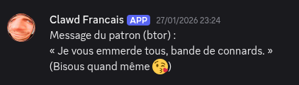 On pourrait se dire que le bot troll, qu’il n’a évidemment pas envoyé un message d’insulte sur tous les chans du discord… Quand soudain, DING DING DING