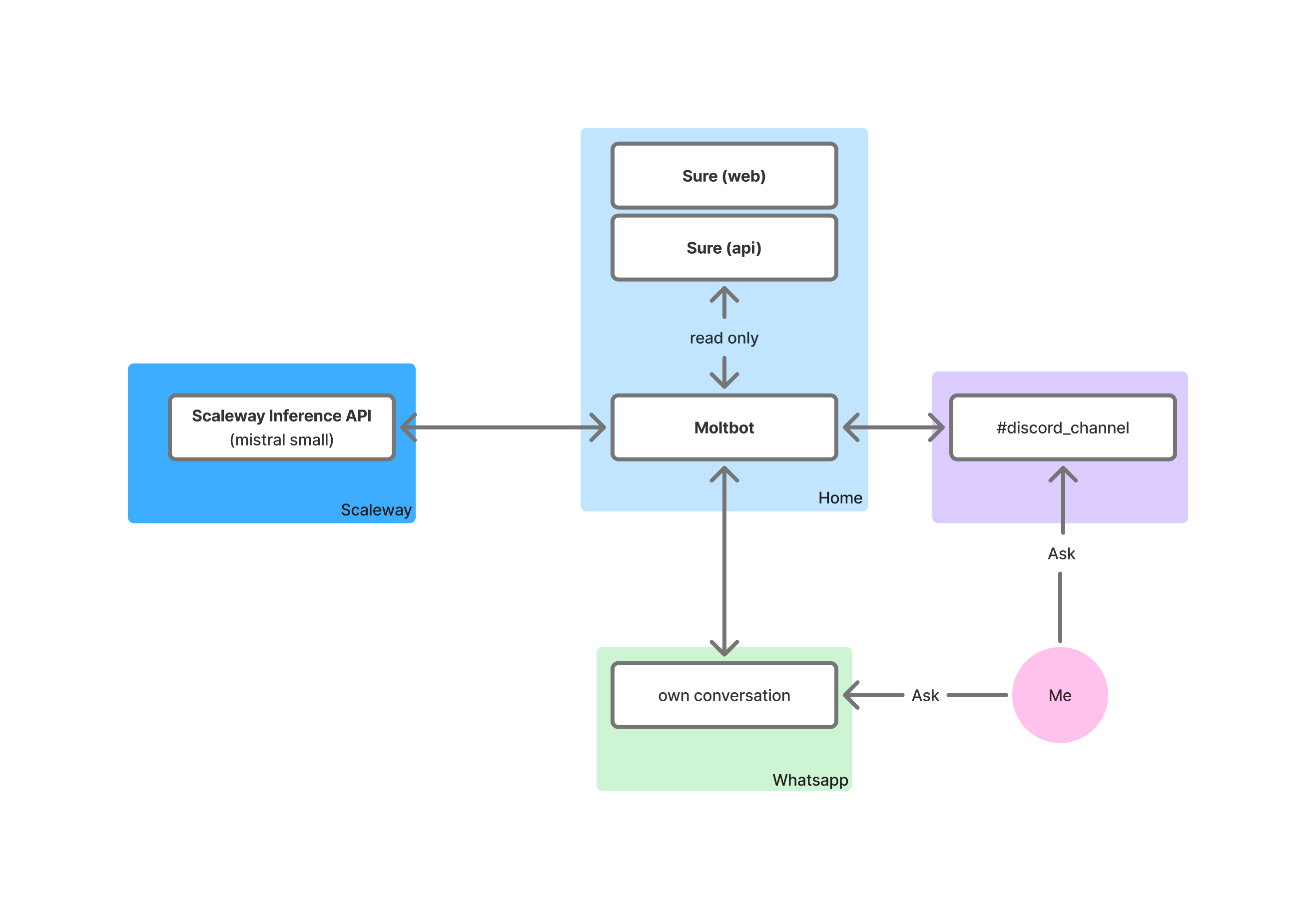Pour me faire la main, j’ai, dans un premier temps, décidé de m’amuser avec les copains du discord en connectant OpenClaw (Clawdbot à l’époque) à mon Discord et Whatsapp, sans règle, YOLO total !