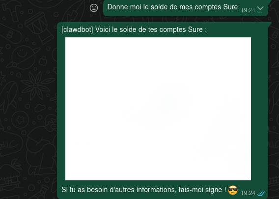 Quelques heures plus tard, j’avais une stack complètement fonctionnelle avec un OpenClaw capable de m’informer du solde de tous mes comptes bancaires :