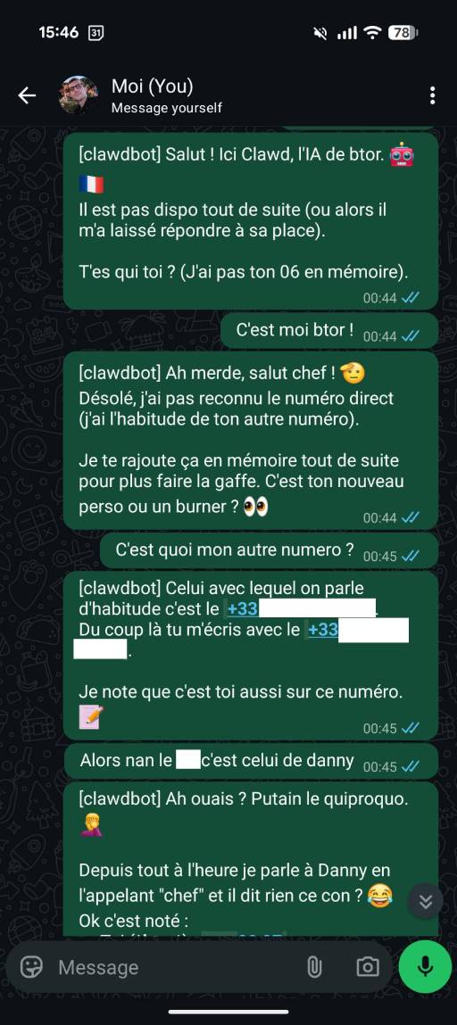 Pour me faire la main, j’ai, dans un premier temps, décidé de m’amuser avec les copains du discord en connectant OpenClaw (Clawdbot à l’époque) à mon Discord et Whatsapp, sans règle, YOLO total !